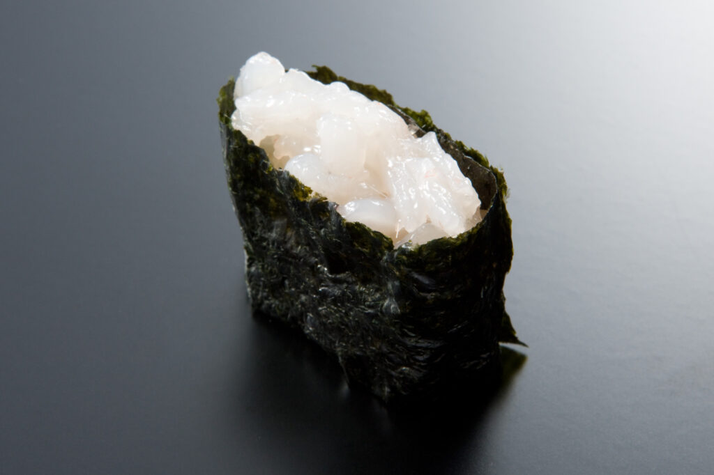 富山湾の宝石と称される白エビを、たっぷりと乗せた軍艦巻き。透き通るような身はやわらかく、口に含むと上品な甘みがゆっくりと広がります。ねっとりとした舌触りの奥に、ほのかな磯の香りが重なり、酢飯の酸味がその甘さを引き立てます。見た目の美しさと繊細な味わいを兼ね備えた一貫は、富山ならではの海の恵みを感じさせる存在。季節や漁の状況によって微妙に変わる風味の違いも、この寿司の楽しみのひとつです。