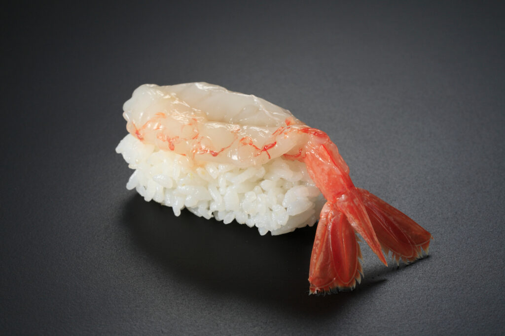 富山湾の深海で育つトヤマエビは、甘エビよりもひとまわり大きく、濃厚な甘みと力強い旨味が特徴です。透き通るような身はねっとりとした食感を持ち、にぎりにすると口の中でゆっくりととろけます。噛むほどに広がる甘みの奥に、深海ならではのコクが感じられ、酢飯の酸味がその旨味を一層引き立てます。見た目の艶やかな美しさも魅力のひとつ。富山湾の恵みを凝縮した、贅沢な一貫です。